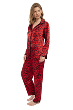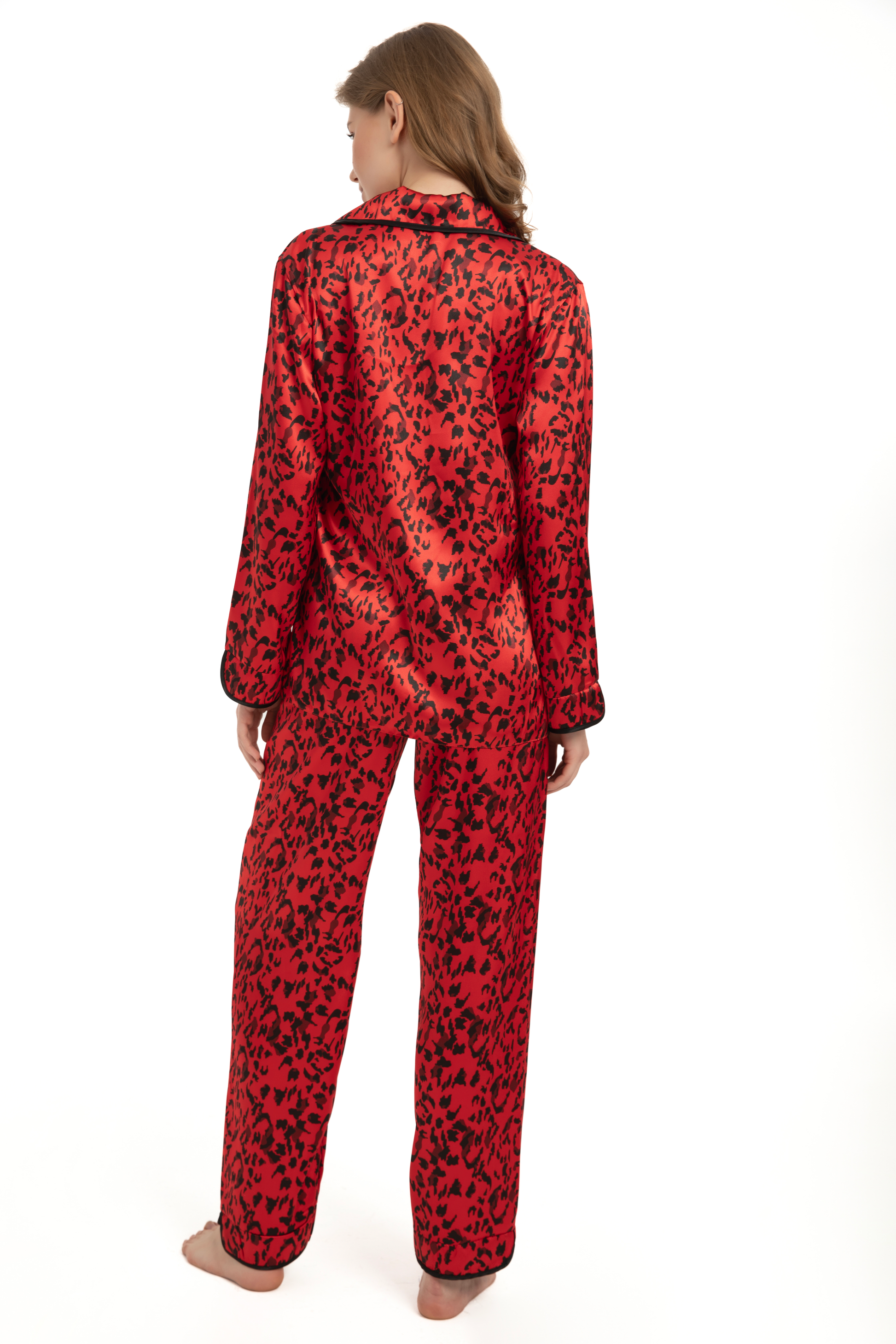 Stilinizi yatak odasında da konuşturun! Kırmızı Leopar Saten Pijama, şıklığı ve konforu bir araya getirerek rüyalarınızdaki uyku deneyimini sunuyor.